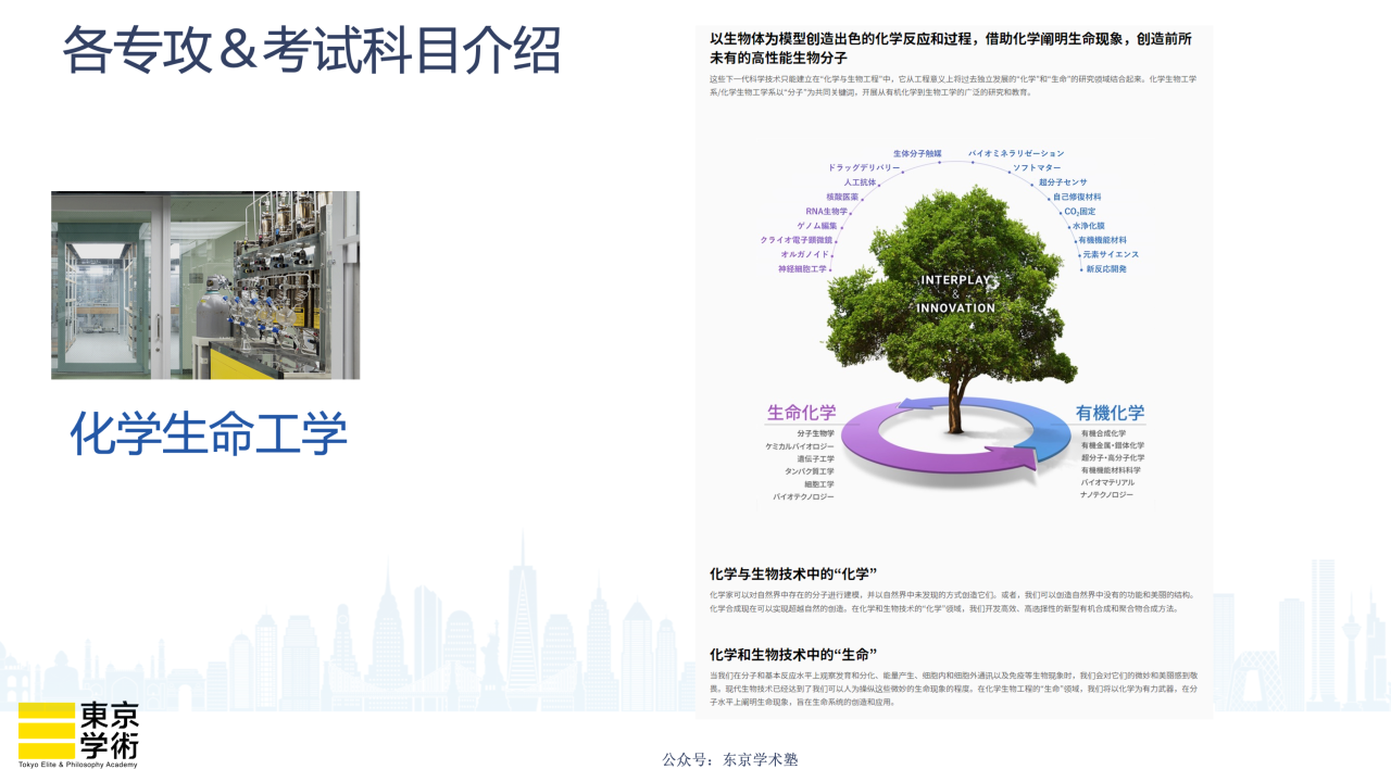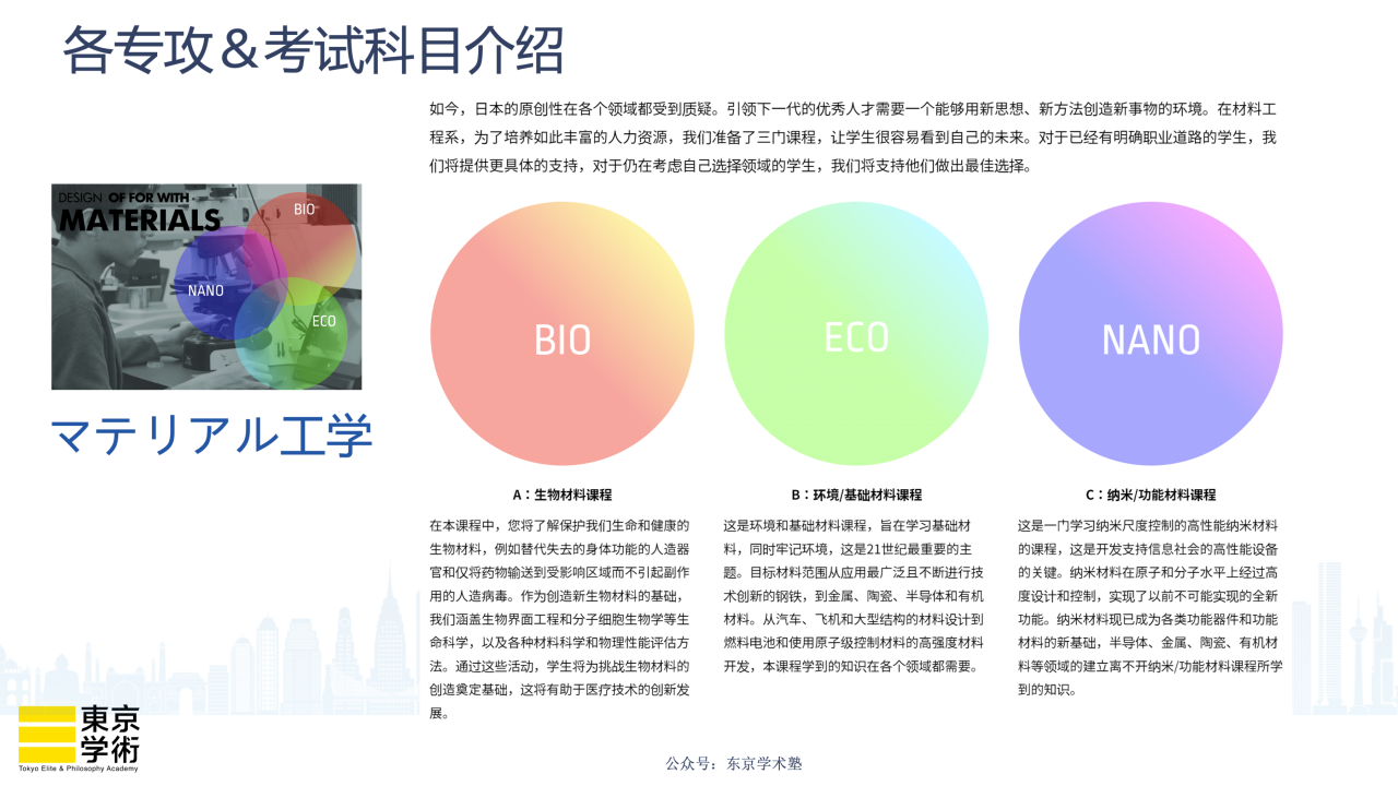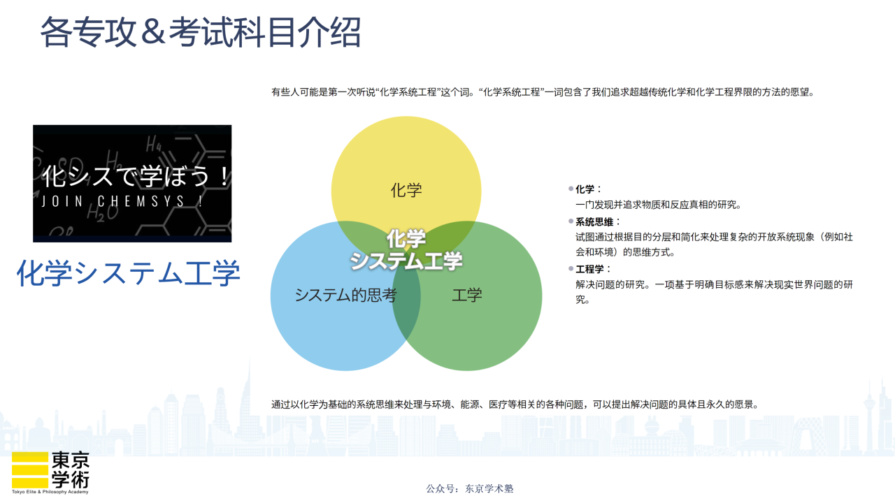但具体来说,其实工学类专攻下的化学还细分为四个方向——材料工学、化学系统工学、化学生命工学、应用化学。下面依然以东大工学系为例为大家详细说明。