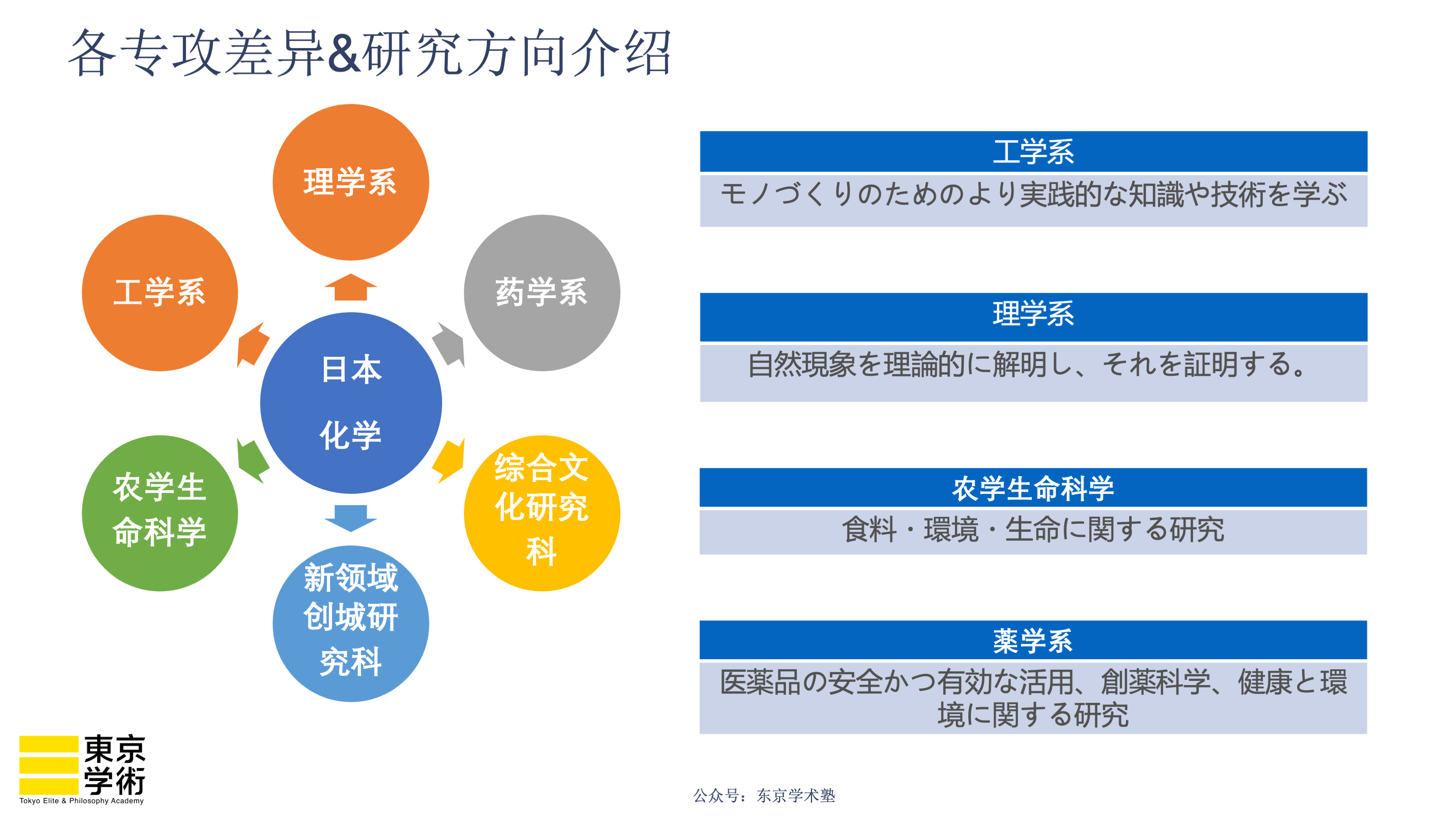 日本每所院校在化学领域的划分存在细微的差别,但是整体出入不大,下面以东京大学为例给同学们介绍一下。